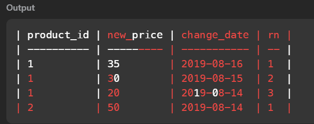 도저히 해결 방안이 안보이던 찰나에 sqld를 공부하다가 랭킹을 세우던 함수가 생각이 났다. 상품 아이디로 파티셔닝을 진행하고 change_date를 내림차순으로 정렬한 row_number()에서 1번 rn을 가져오면 될 것 같았다.