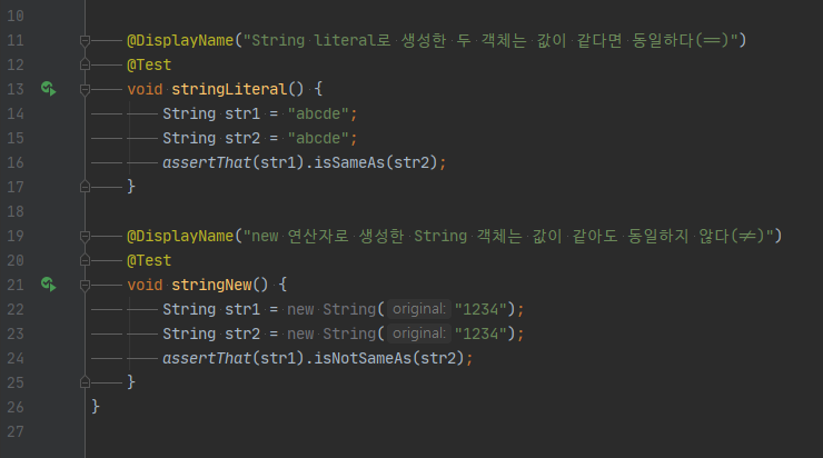 즉 String 리터럴로 생성한 객체는 내용이 같다면 같은 객체, 즉 동일한 메모리 주소를 가리키고 있다는 것이다!