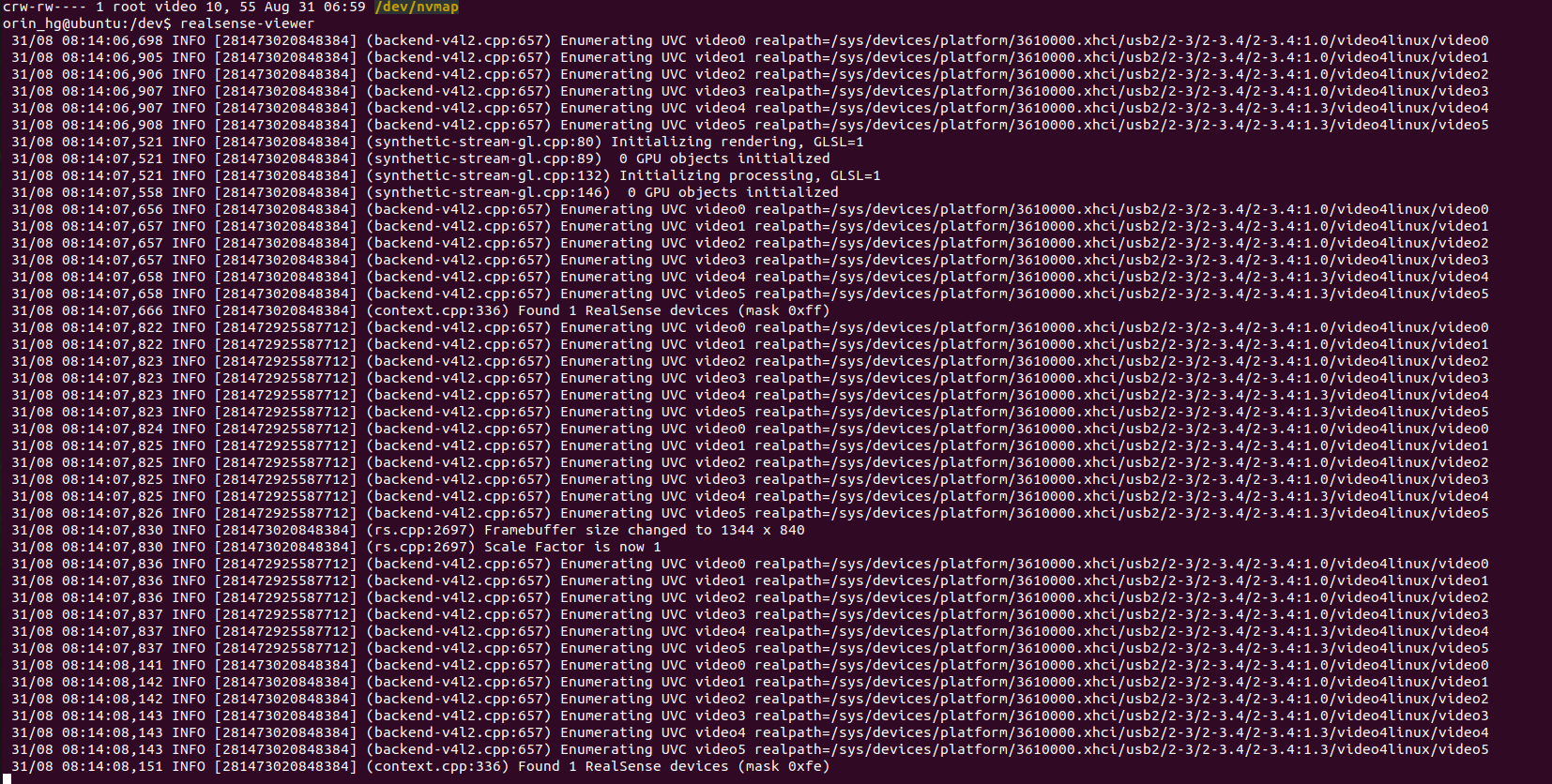 Linux 커널영역에서 system call 과정에서 권한 에러가 발생한 곳을 찾아서 해결할 수 있었다. Strace 를 설치하여 realsense-viewer의 프로세스가 동작하는 과정을 txt에 저장하여 cat trace.txt | grep dev를 통해서 /dev에 접근하는 파일들을 확인했다.