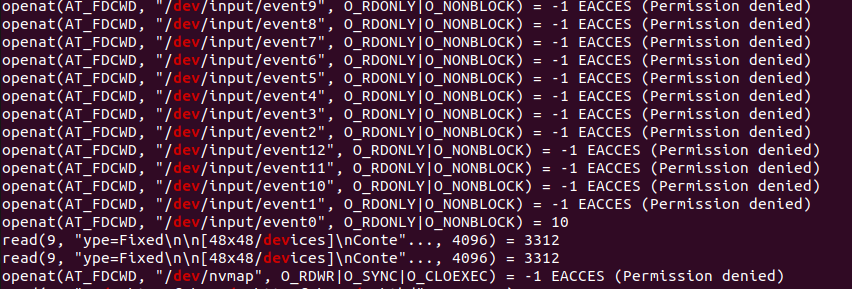 /dev/input/event 와 /dev/nvmap 두 군데에서 권한 에러가 발생한 것을 확인했다.