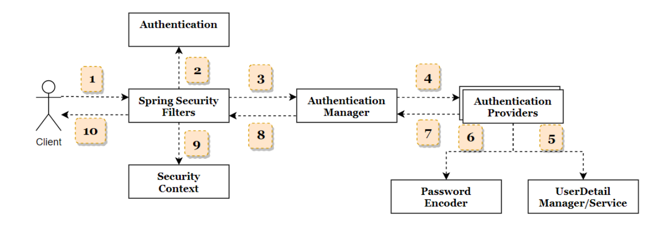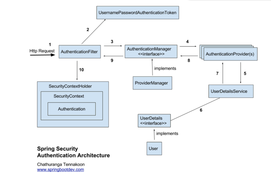 - 7. Provider는 UserDetailsService에서 반환된 UserDetails와 클라이언트가 제공한 인증정보(Token)를 대조해서 이용자가 유효한 사용권한을 가지고 있는지 확인한 뒤 SecurityContext에 저장한다.