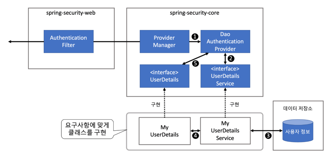 - 5. AuthenticationManage 가 우리가 직접 커스텀한 서비스클래스(UserDetailsService 구현 클래스)에 해당 유저에게 인증요청을 보내 사용자 정보를 가져온다.
