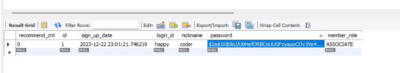 비밀번호 암호화 과정까지 적용하여 postman을 통한 몇가지 테스트를 진행해보았고 아래는 결과 사진이다.