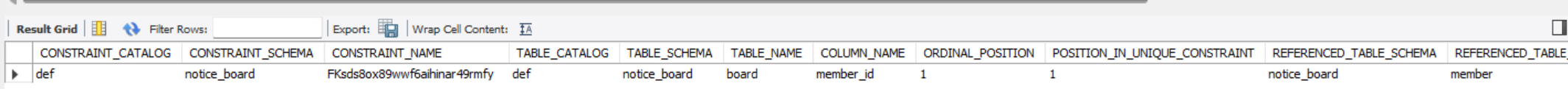 WHERE TABLE_SCHEMA = 'notice_board' AND TABLE_NAME = 'board' AND REFERENCED_TABLE_NAME = 'member';