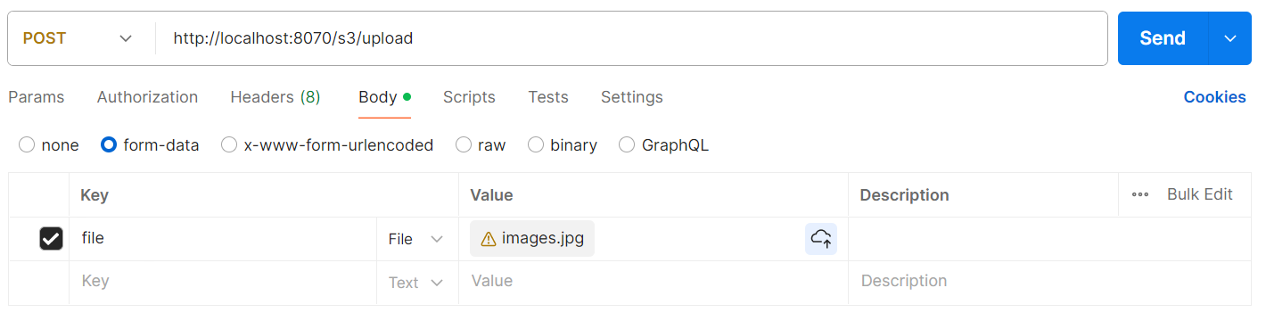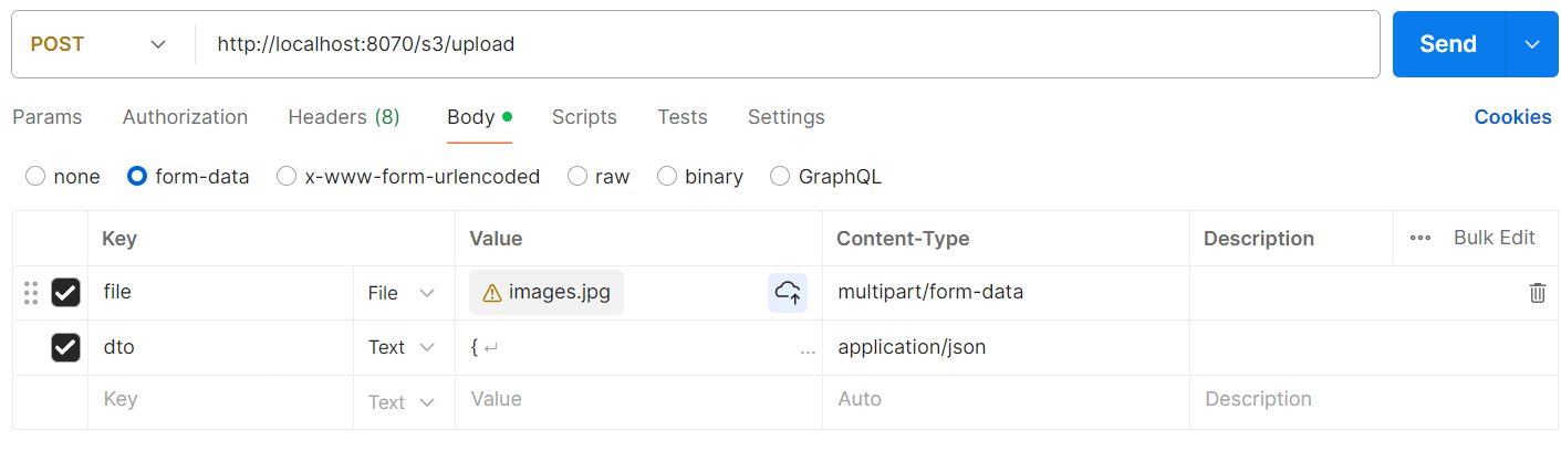 Postman을 활용하여 업로드 테스트를 진행하였다. form-data에는 file을 업로드하고, raw 에는 requestDto 값들을 작성하여, HttpMediaTypeNotSupportedException 예외를 마주했다.