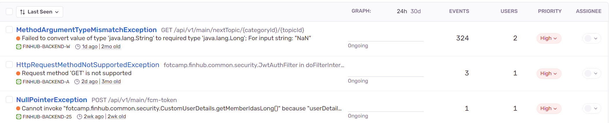 기존에는 사전에 정의해둔 에러를 제외한 500번대 에러들은 exceptionhandler가 수집해 sentry로 에러 로그를 전송해 모니터링하고 있었다.